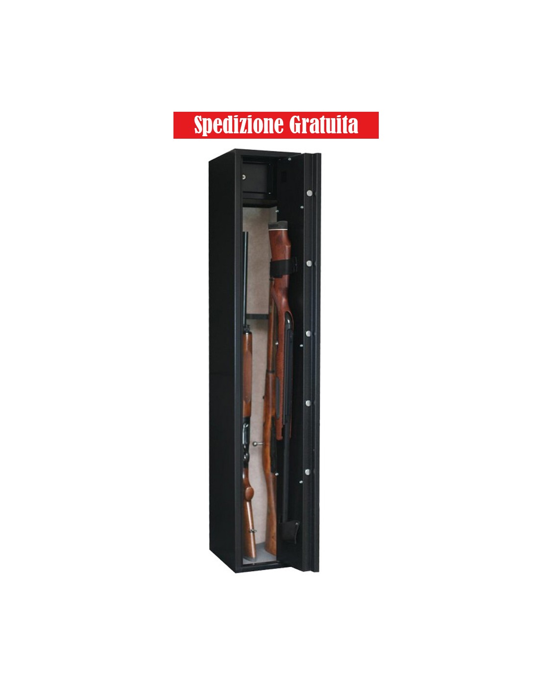 La cassaforte CLT10 può ospitare 8 armi con ottica, più due nella porta.Ha un ampio tesoretto fornito di 2 chiavi di sicurezza, dove poter depositare munizioni, pistole o altro.La Clt10 ha finiture di pregio ed è una cassaforte porta fucili in classe S1.Costruita in acciaio di ottima qualità DD12 con spessore della struttura di 3mm, ha 5 cilindri in...